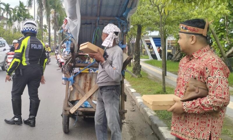 Banjarmasin, //TintaPos.Com// – 5 Maret 2026 – Menjelang waktu berbuka puasa Ramadhan, suasana kebersamaan dan kepedulian sosial tercipta di kawasan Kayu Tangi, Banjarmasin. Apri Wilianto dari Perkumpulan Pemuda Dayak Banjarmasin memimpin aksi pembagian 150 nasi kotak takjil gratis bersama Satlantas Polresta Banjarmasin.
