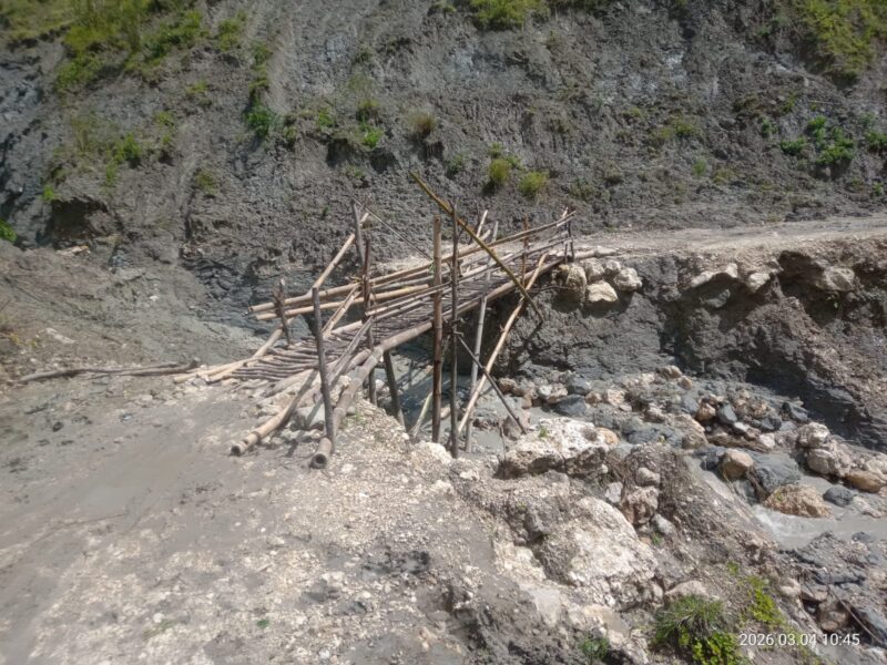 Selain jalan rusak, warga juga menghadapi kondisi jembatan kecil yang menjadi akses utama antarwilayah desa. Karena belum ada pembangunan permanen, masyarakat secara swadaya membangun jembatan kayu melalui gotong royong. Meski berguna, warga mengaku jembatan tersebut rawan rusak dan berisiko membahayakan pengguna jalan.