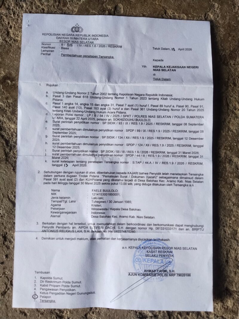 Nias Selatan, 15 April 2026 //Tintapos.com// — Polres Nias Selatan menetapkan Kepala Desa (Kades) Balohao berinisial FB sebagai tersangka dalam kasus dugaan pemalsuan ijazah. Penetapan tersangka tersebut dilakukan pada 13 April 2026, menyusul laporan masyarakat terkait penggunaan dokumen yang diduga tidak sah.