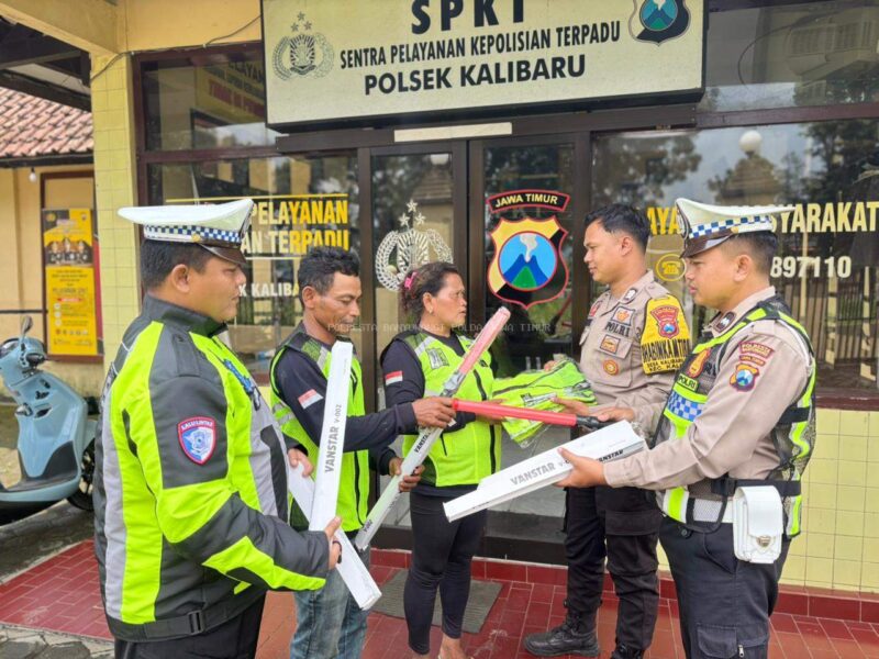 BANYUWANGI,//Tintapos.com// – Personel Polsek Kalibaru, di bawah naungan Polresta Banyuwangi, menunjukkan kepedulian nyata terhadap keselamatan pengguna jalan di jalur rawan bencana. Pada Kamis (9/4/2026), jajaran kepolisian menyambangi para relawan di Jalur Gumitir untuk memberikan bantuan sarana prasarana berupa rompi dan senter lantas.