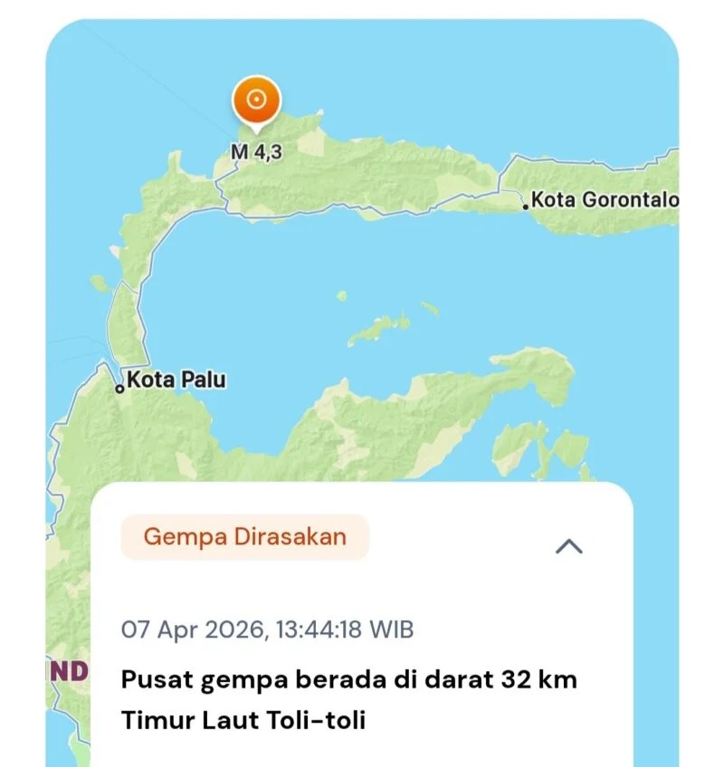 TOLITOLI, //Tintapos.com// – Gempa bumi dengan kekuatan magnitudo 4,3 mengguncang wilayah Tolitoli pada Senin, 7 April 2026, sekitar pukul 14.44 WITA. Getaran gempa dilaporkan dirasakan oleh warga, terutama yang berada di dalam rumah dan bangunan bertingkat.