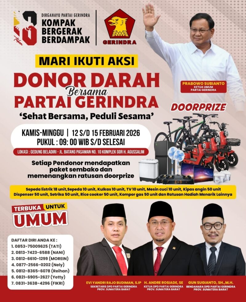 Padang – //TintaPos.Com// – Dalam rangka memperingati Hari Ulang Tahun (HUT) ke-18, Partai Gerakan Indonesia Raya (Gerindra) Provinsi Sumatera Barat menggelar kegiatan sosial donor darah sebagai bentuk kepedulian terhadap sesama dan kontribusi nyata bagi masyarakat.