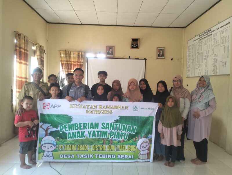 Perawang-Siak //TintaPos.Com// – Dalam rangka penutupan Bulan Suci Ramadhan 1447 H sekaligus menyambut Hari Raya Idul Fitri 1447 H dan memperkuat komitmen terhadap tanggung jawab sosial perusahaan, PT Arara Abadi salah satu unit usaha APP Group Regional Riau pada Hari Selasa, 17 Maret 2026 melaksanakan program penyaluran bantuan untuk Anak yatim serta berbagai inisiatif Program CSR (corporate social responsibility) yang menjangkau lima desa di Kabupaten Siak seperti: Santunan Anak Yatim, Safari Ramadhan seta Renovasi Rumah Ibadah. Adapun desa-desa yang mendapatkan program Ramadhan dan CSR dari Perusahaan diantaranya: Desa Lubuk Jering, Desa Muara Bungkal, Desa Bencah Umbai, Desa Tasik Betung dan Desa Lubuk Umbut. Dan dua desa di Kabupaten Bengkalis diantaranya: Desa Melibur dan Desa Tasik Tebing Serai.