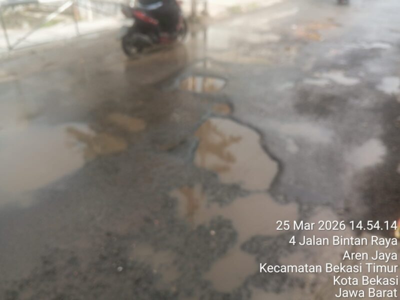 Kota Bekasi, //TintaPos.Com// — Kondisi jalan rusak di Kelurahan Aren Jaya, Kecamatan Bekasi Timur, Kota Bekasi, kembali menjadi keluhan warga. Sejumlah ruas jalan lingkungan dilaporkan mengalami kerusakan cukup parah berupa lubang, retakan aspal, serta genangan air yang membahayakan pengguna jalan.25 Maret 2026