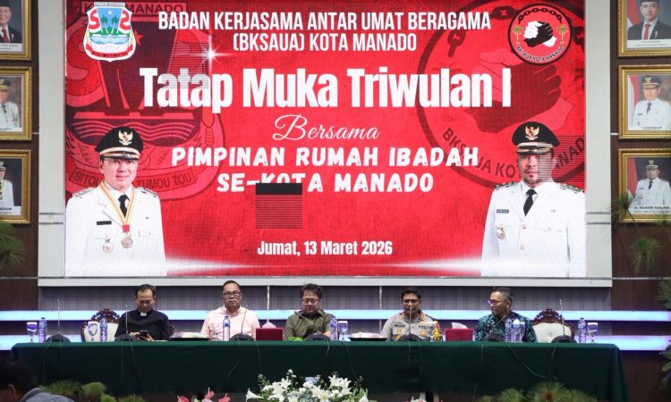 MANADO //Tintapos.com// – Humas Polresta Manado – SULUT , Kapolresta Manado Kombes Pol Irham Halid menghadiri kegiatan Tatap Muka Triwulan I bersama pimpinan rumah ibadah se-Kota Manado yang dilaksanakan di Aula Serbaguna Kantor Wali Kota Manado. Kegiatan tersebut menjadi wadah silaturahmi sekaligus forum koordinasi antara pemerintah daerah, aparat keamanan, dan para tokoh agama dalam rangka memperkuat komunikasi serta sinergitas menjaga situasi keamanan dan ketertiban masyarakat (kamtibmas) yang aman dan kondusif di Kota Manado, Jumat (13/3/2026).