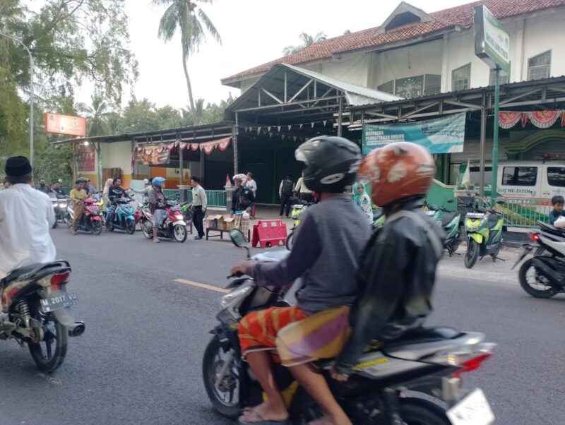 Majelis Wakil Cabang Nahdlatul Ulama (MWC NU) yang berkantor di Desa Pakamben Laok Kecamatan Pragaan, Kabupaten Sumenep, menggelar aksi berbagi takjil kepada pengguna jalan di Jalan Raya Pamekasan – Sumenep tepatnya di depan kantor gedung NU Pakamben Laok Kecamatan Pragaan, Senin, 9 Maret 2026. Kegiatan yang melibatkan puluhan kader dan badan otonom NU itu dilanjutkan dengan doa bersama serta buka puasa.