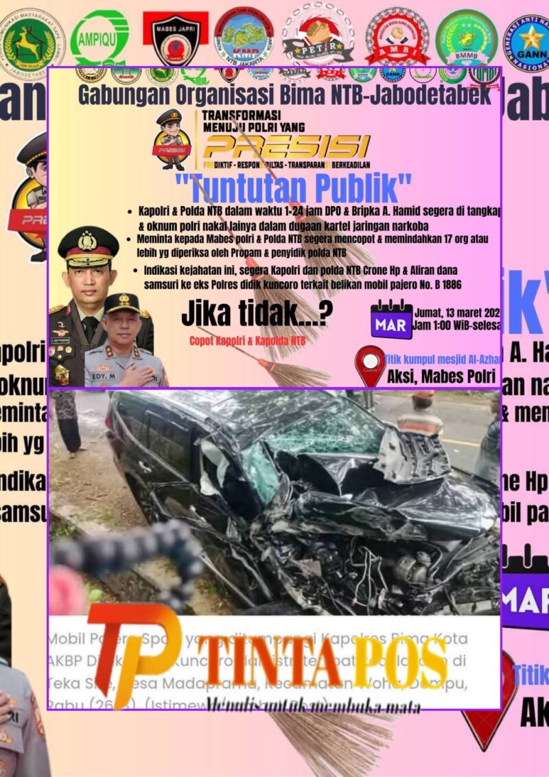 JAKARTA //TintaPos.Com// – Gabungan Organisasi Bima NTB-Jabodetabek terus menggelar aksi unjuk rasa di Markas Besar (Mabes) Polri dengan menuntut penangkapan beberapa oknum bandar narkoba yang diduga ada di dalam tubuh Polri di Bima, Nusa Tenggara Barat (NTB). Selain itu, mereka juga mendesak pemeriksaan terhadap Ketua DPRD Kota Bima Syamsurih serta pemindahan dan pencopotan 17 anggota polisi yang tengah diperiksa di Bidang Profesi dan Pembinaan (Propam) Polda NTB.