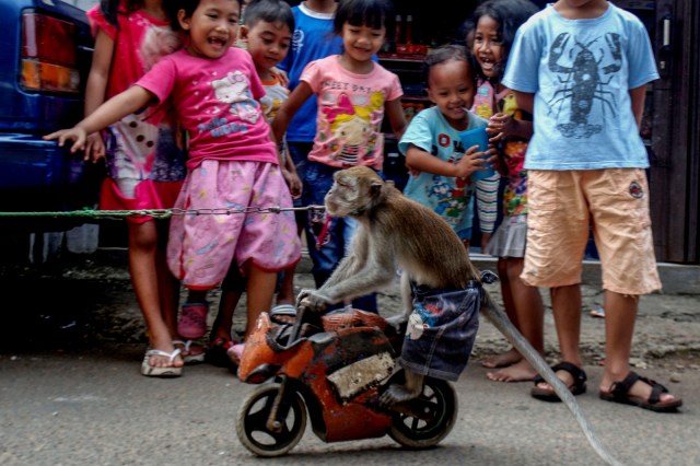 Sayangnya dalam atraksi topeng monyet itu, mereka tidak benar-benar unjuk gigi. Ada rantai yang mengikat leher si monyet.