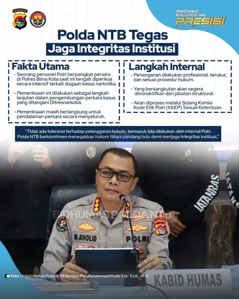 Kombes Pol Muhammad Kholid menjelaskan bahwa informasi yang telah diunggah melalui akun resmi tersebut terwujud nyata dalam penanganan dugaan keterlibatan seorang anggota Polri berpangkat perwira di jajaran Polres Bima Kota dalam kasus narkotika, yang telah memasuki tahap pemeriksaan intensif oleh Direktorat Reserse Narkotika (Ditresnarkoba) Polda NTB. Menurutnya, seluruh proses penanganan kasus ini dilakukan secara profesional, terukur, dan sepenuhnya sesuai dengan prosedur hukum yang berlaku, tanpa ada unsur pilih kasih atau pemisahan perlakuan.