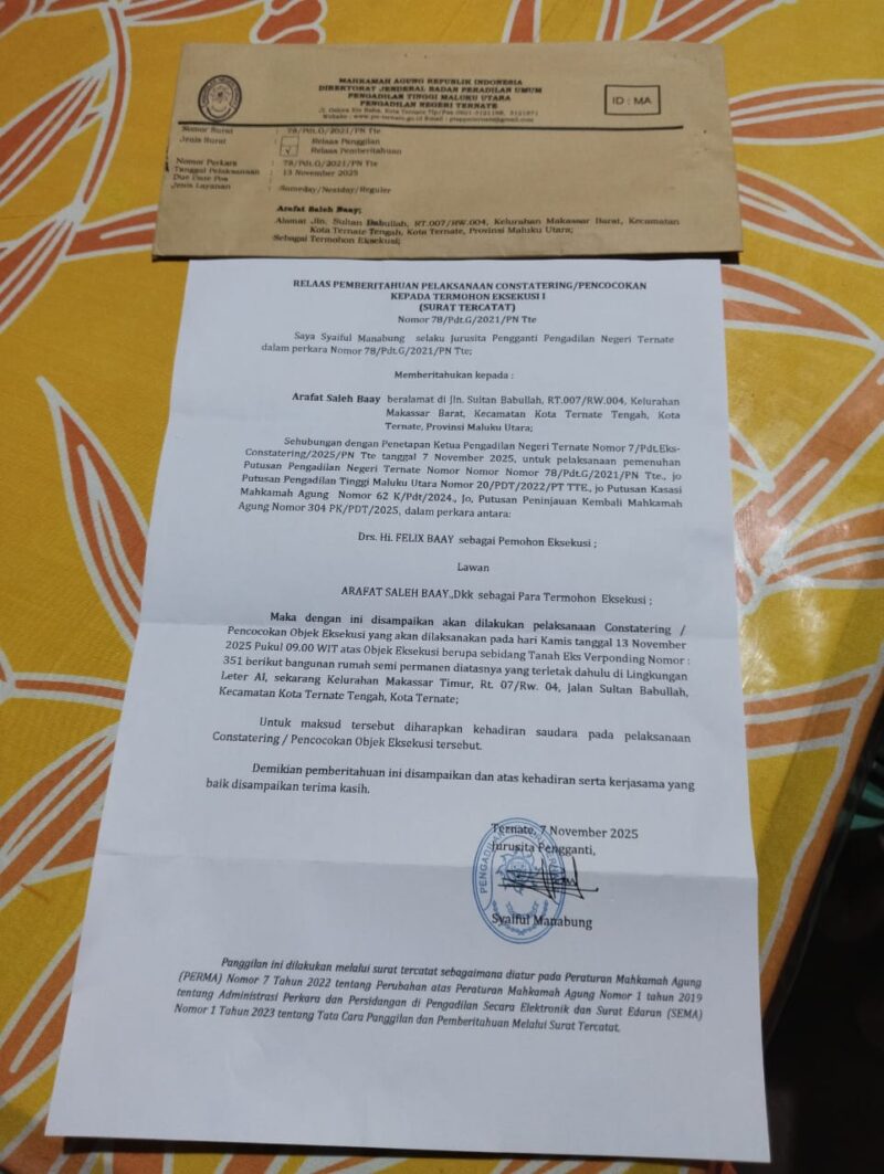 Jakarta //TintaPos.Com// – 10 November 2025 — Penetapan Ketua Pengadilan Negeri Ternate Nomor 7/PDT.Eks Constatering/2025/PN.TTe tertanggal 7 November 2025, terkait pelaksanaan pemenuhan putusan Pengadilan Negeri Ternate Nomor 78/PDT.G/2021/PN.Tte jo Pengadilan Tinggi Maluku Utara Nomor 20/PDT/2022/PT.TTE jo putusan Mahkamah Agung Nomor 62 K/PDT/2024 jo Peninjauan Kembali Nomor 304 PK/PDT/2025, menuai polemik hukum serius.