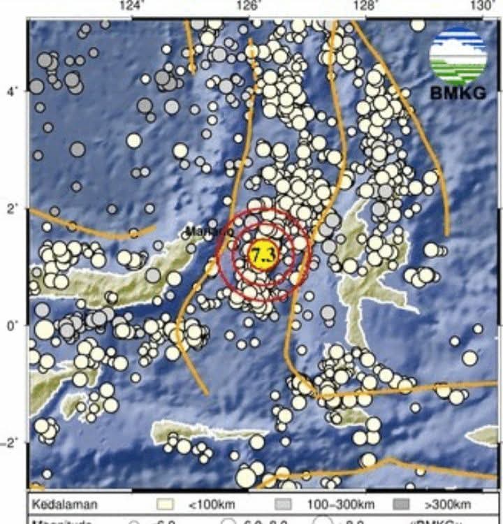 Berdasarkan laporan resmi BMKG yang gempa pertama memiliki magnitudo 7,3, dengan pusat berada di 127 km tenggara Bitung pada koordinat 1,21 LU – 126,25 BT dan kedalaman 18 km.